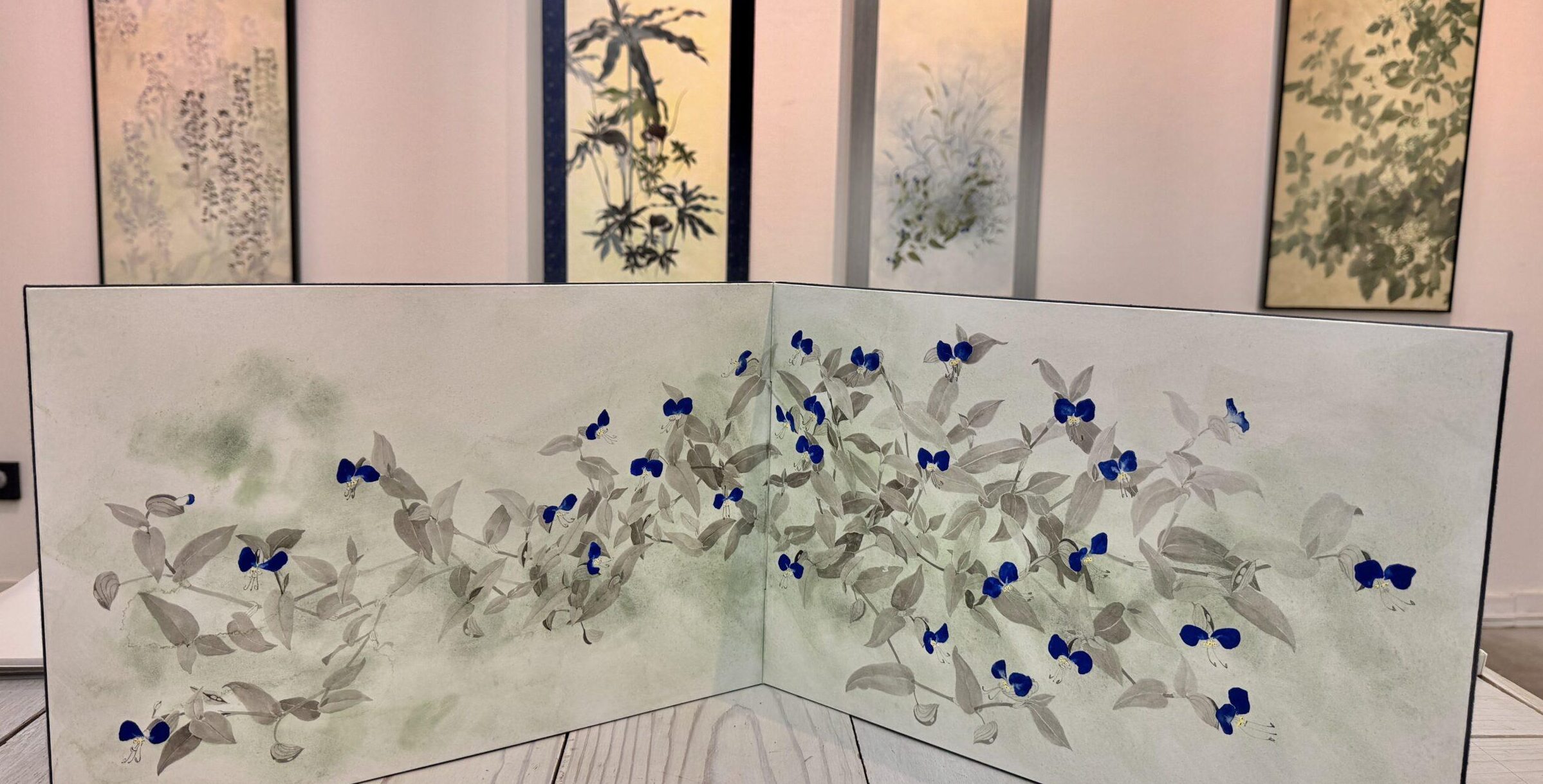 岩絵具の柔らかな色合いの花々が静かに咲き乱れ、まるで別世界のよう。